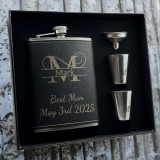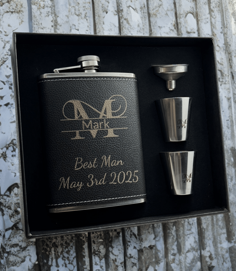 This elegant hip flask set is the perfect gift for a best man or Father’s Day. Crafted from durable stainless steel and wrapped in premium leather, the flask offers a sophisticated yet rugged look. Its sleek, pocket-friendly design makes it easy to carry, while the secure screw-on cap prevents spills. The set includes a matching funnel for easy refills and two stainless steel shot cups, making it ideal for toasting special moments. Packaged in a stylish gift box, this flask set is a thoughtful and timeless keepsake.